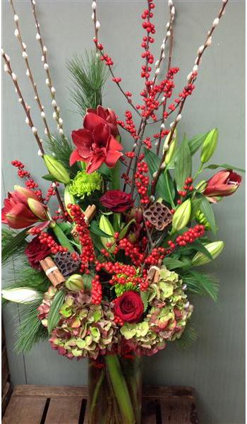 Stunning vase arrangement with lilies, roses, ilex berries, amaryllis and complimentary Christmas foliage.